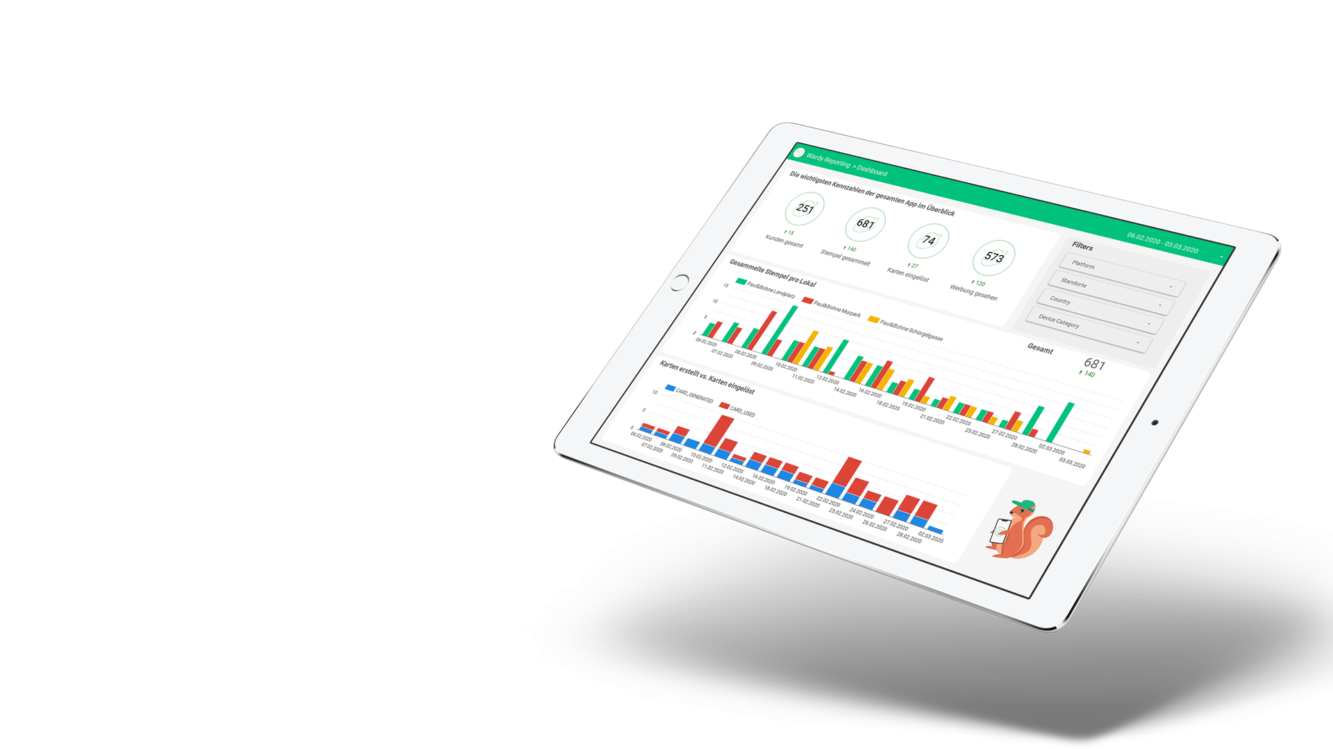 Alle Zahlen auf einem Blick. Egal ob Livetracking der Stempel, Details über die eingelösten Stempelkarten oder Anzahl deiner Kunden, die deine Werbung gesehen haben. Du hast alle Zahlen immer und überall im Blick. Du möchtest eine Werbung erstellen und sehen wie diese performed? Sichtbar im Portal. Du willst wissen an welchem Tag, wie viel gestempelt wird? Das Portal machts‘ möglich!
